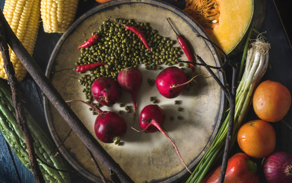 une grande variété de viandes, de légumes, de fromages et beaucoup d’épices et d’herbes.